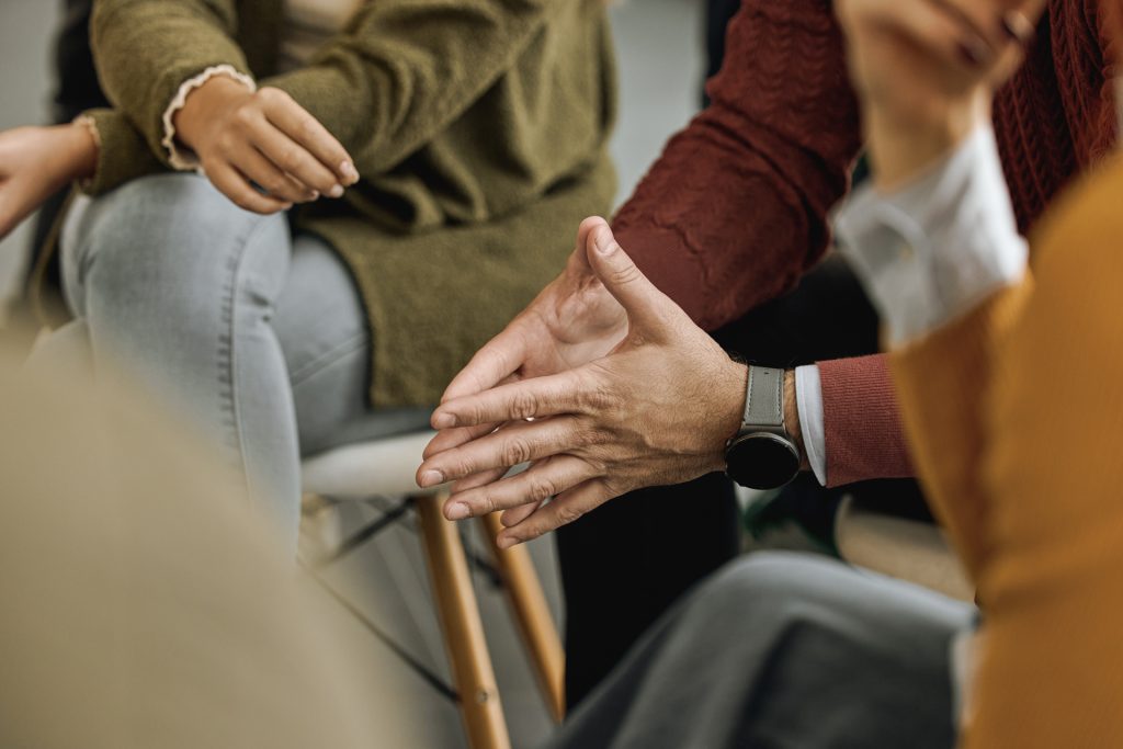 Nahaufnahme einer Gruppentherapiesitzung, Personen auf Stühlen, Fokus auf gefaltete Hände.